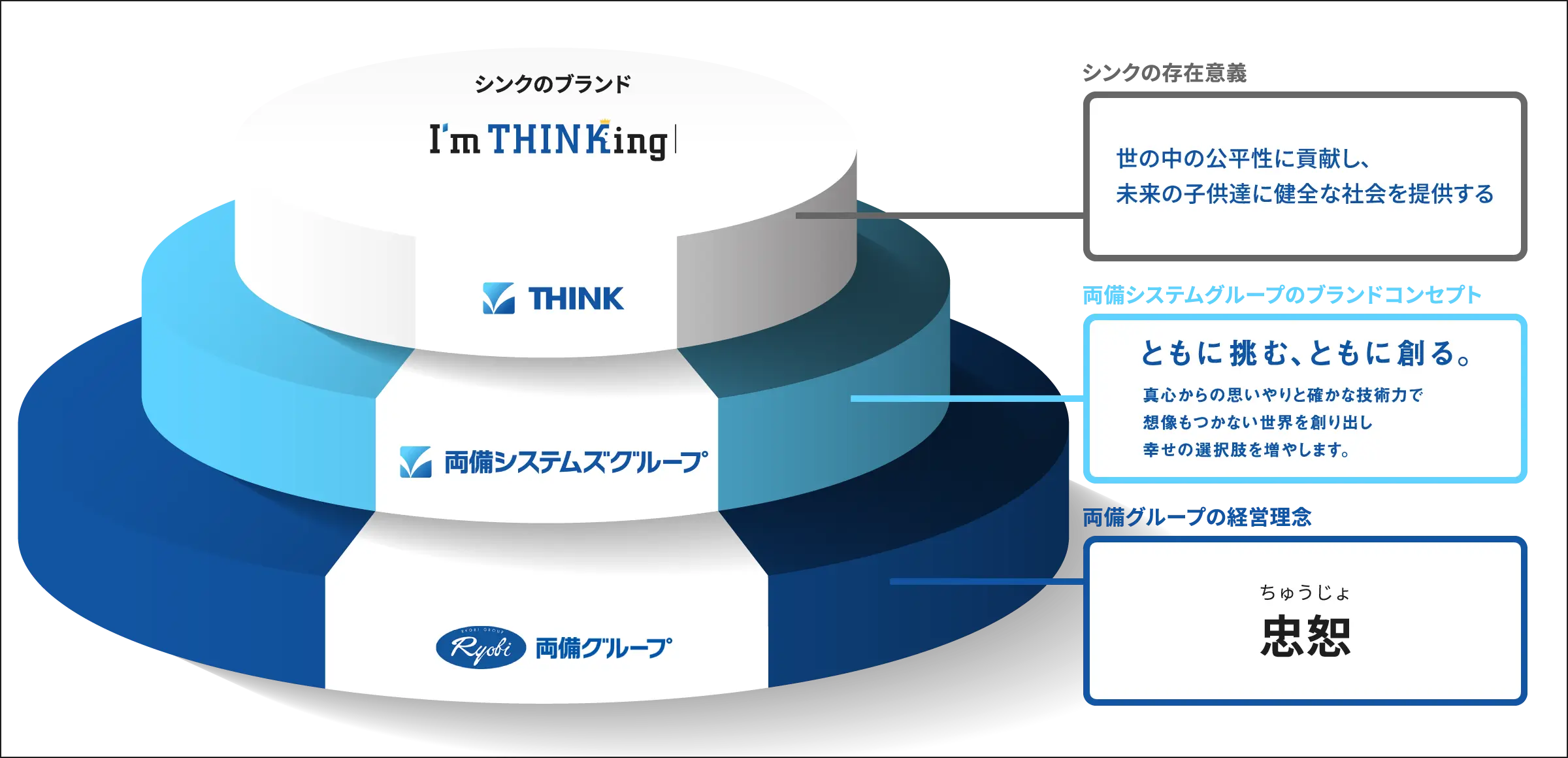 シンクのブランド「I'm THINKing」は、両備グループ全体の理念である「忠恕」を、すべての元となる考え方として出発点とし、さらに、両備システムズグループのパーパス体系および「Ryobi Systems Group Way」からの継承と、シンクの存在意義「世の中の公平性に貢献し、未来の子供達に健全な社会を提供する」から落とし込むかたちで、考えられたものです。